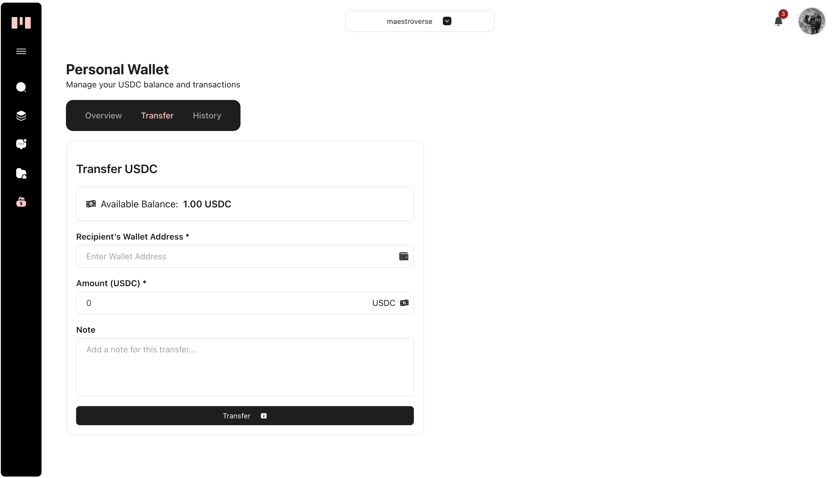 Next, copy the exact address and add use as the Recipient’s Wallet Address in the transfer form on Maestroverse and click transfer as seen below. You will get a Debit alert from us.